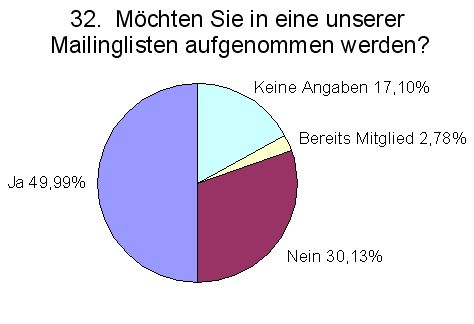 Dass es sich hierbei größtenteils um neue Mitarbeiter handeln würde, zeigt die relativ geringe Anzahl von Anwendern, die bereits Mitglieder einer OpenOffice.org-Mailingliste sind. Während weniger als 3% bereits in einer Mailingliste eingeschrieben sind, möchten 50% in den Mailverkehr des Projektes eingebunden werden.